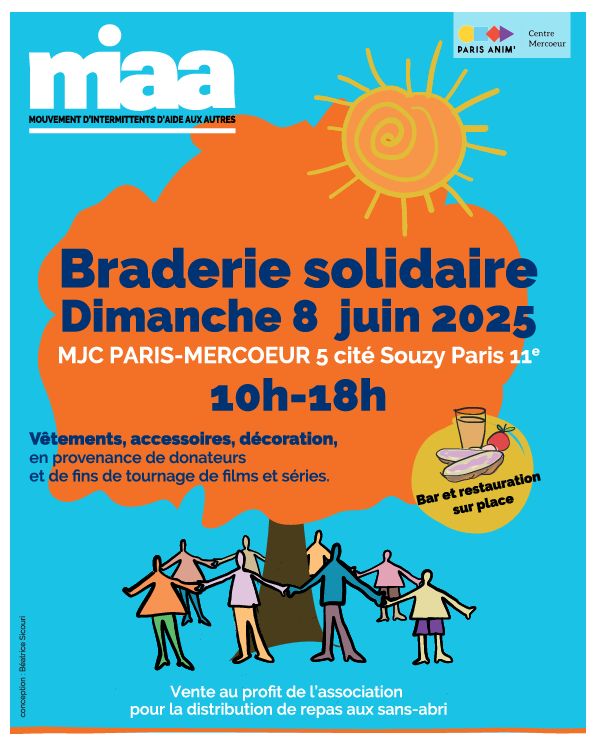 Le MIAA (Mouvement d’Intermittents d’Aide aux Autres) organise sa braderie le dimanche 8 juin, au Centre Mercoeur, 5 cité de Souzy Paris 11ème.
