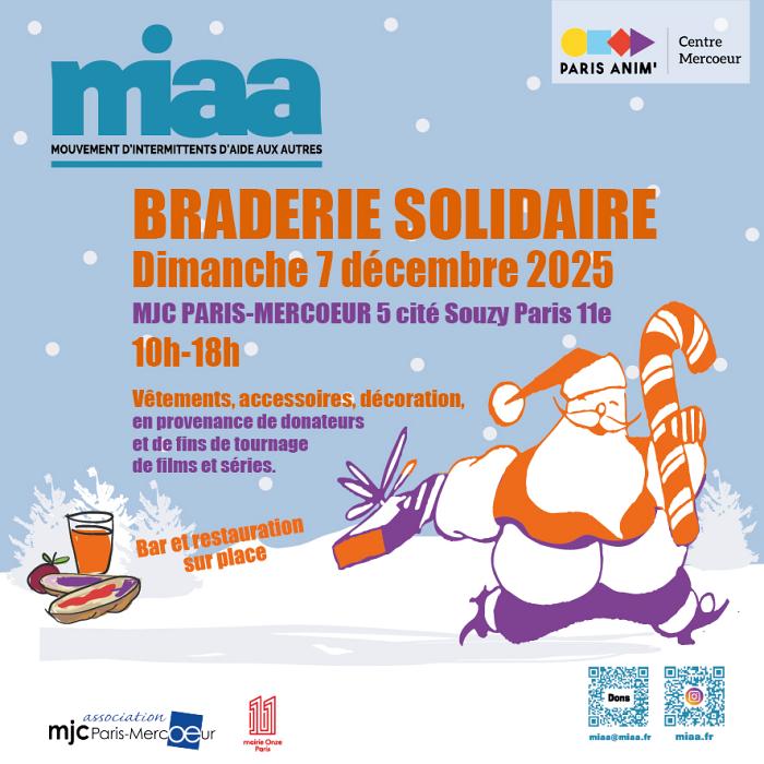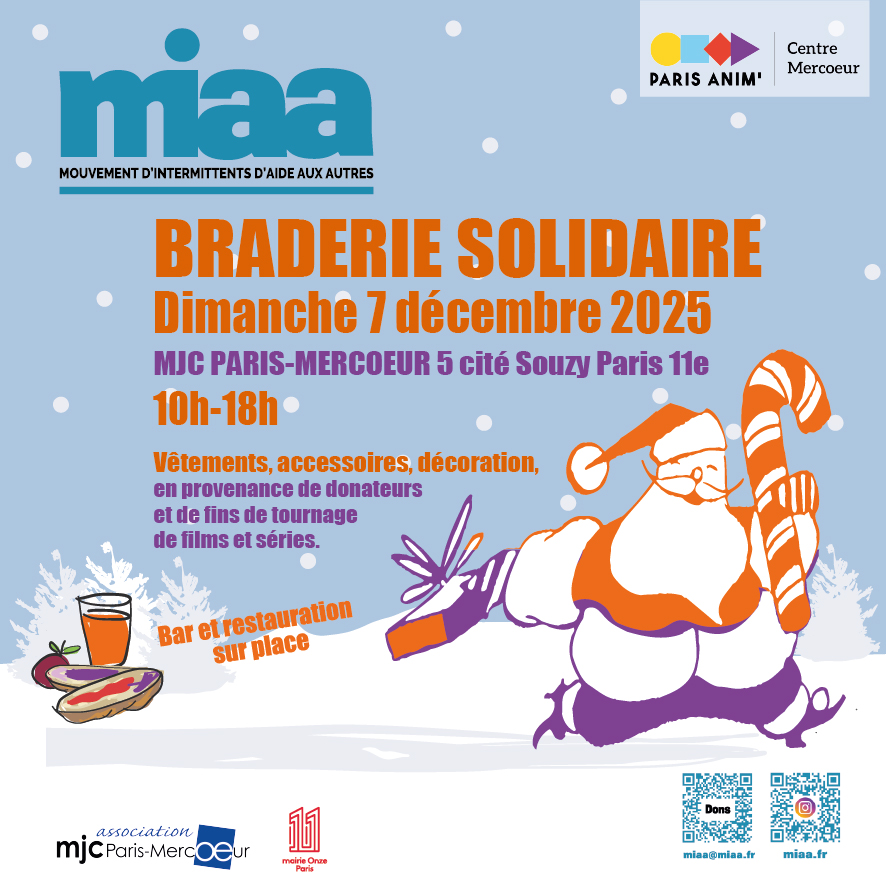 MIAA (Mouvement des Intermittents d’Aide aux Autres) organise sa prochaine Braderie le dimanche 7 décembre au Centre Mercoeur - 5 cité Souzy dans le 11ème.