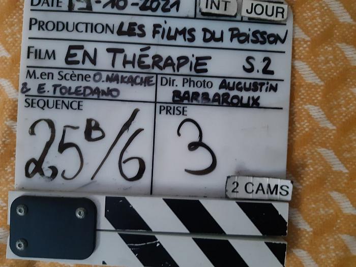 C’est une fin de tournage pour la saison 2 de "En thérapie", avec comme réalisateurs/trices pour cette saison : O.Nakache et E.Toledano, A. Desplechin, E. Bercot, A. Jaoui et E. Finkiel, produit par les films du Poisson, chef décorateur Etienne Rhode, accessoiriste Marie Devaux, chef operateur A. Barbaroux et Q. De Lamarzelle.