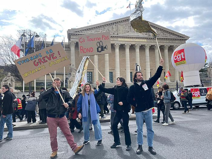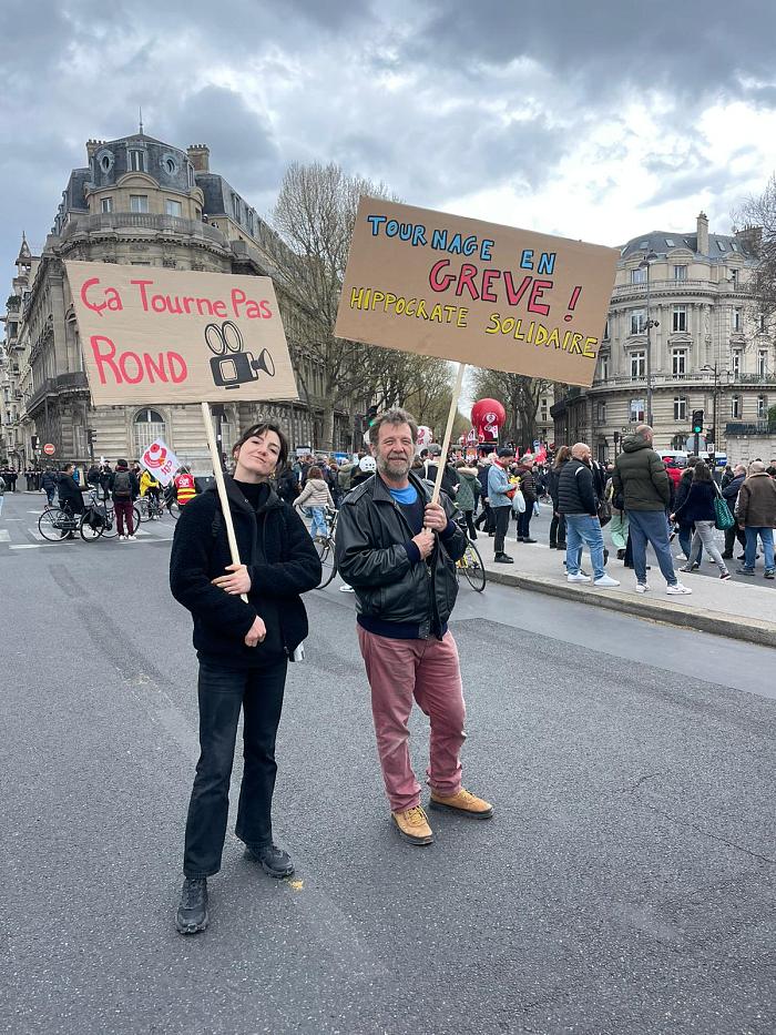 « Après avoir voté l’ arrêt total du tournage lors de la journée de grève du 28 mars, l’équipe du tournage d’Hippocrate saison 3 a voté cette fois-ci l’envoi d’une délégation représentant le tournage lors de la manifestation contre la réforme des retraites du 06 avril !