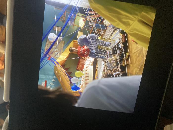 Tous sont à l’oeuvre dans des situations rocambolesques : Ken fait de la Tyrolienne, L’hélicoptère passe entre les looping du circuit automobile, Le train électrique tresse un tabouret, les bonhommes gluants se catapultent à l’aquarium, les peluches lâchent des ballons gonflés d’hélium...